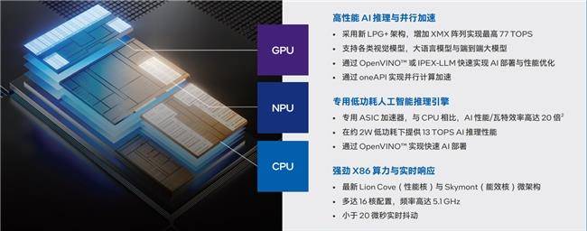 这颗 SoC,就是酷睿 Ultra 处理器。它在单一封装内集成了 CPU、英特尔锐炫™ GPU 和 NPU,并让三者协同工作,AI推理能力、高性能CPU计算与工业级实时控制,“一手”拿捏。